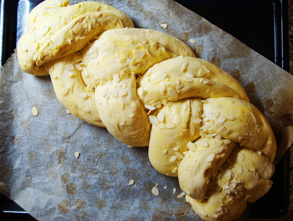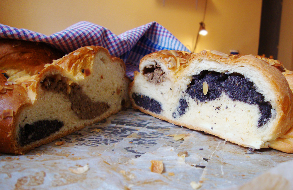 Droždí smícháme s trochou vlažného mléka, lžící cukru a mouky. Necháme vzejít kvásek na teplém místě. Mezitím do mísy prosejeme mouku, přidáme vejce, cukr, sůl a teplé mléko s rozpuštěným máslem. Nakonec přilijeme kvásek a vypracujme hladké těsto. Mísu zakryjeme utěrkou a necháme kynout. Po 30 minutách propracujeme a dáme znovu na 30 minut odpočívat. Mezitím si připravíme náplně. Na ořechovou svaříme mléko s rumem a cukrem. Přisypeme opražené ořechy a mícháme, dokud směs lehce nezhoustne. Odstavíme, vmícháme žloutek a piškoty. Na makovou svaříme mléko, rum, cukr, skořici a mák. Po zhoustnutí odstavíme a vmícháme piškoty. Na tvarohovou utřeme tvaroh s cukrem, extraktem, vejcem a pudinkovým práškem. Nakonec vmícháme rozinky. Troubu předehřejeme na 180 stupňů. Těsto rozdělíme na tři díly a vyšoulíme z nich hady o délce 30 cm. Každého hada rozválíme do šířky a rozložíme do něj rovnoměrně jednu celou náplň. Hadovi nějakým hezkým způsobem spojíme bříško. Všechny hady vyrovnáme vedle sebe a upleteme z nich cop, který ale příliš neutahujeme. Potřeme vejcem, posypeme mandlemi a necháme ještě 15 minut kynout. V troubě pečeme na 180 stupňů po dobu 15 minut, poté ztlumíme na 160 stupňů a dopečeme ještě půl hodiny.