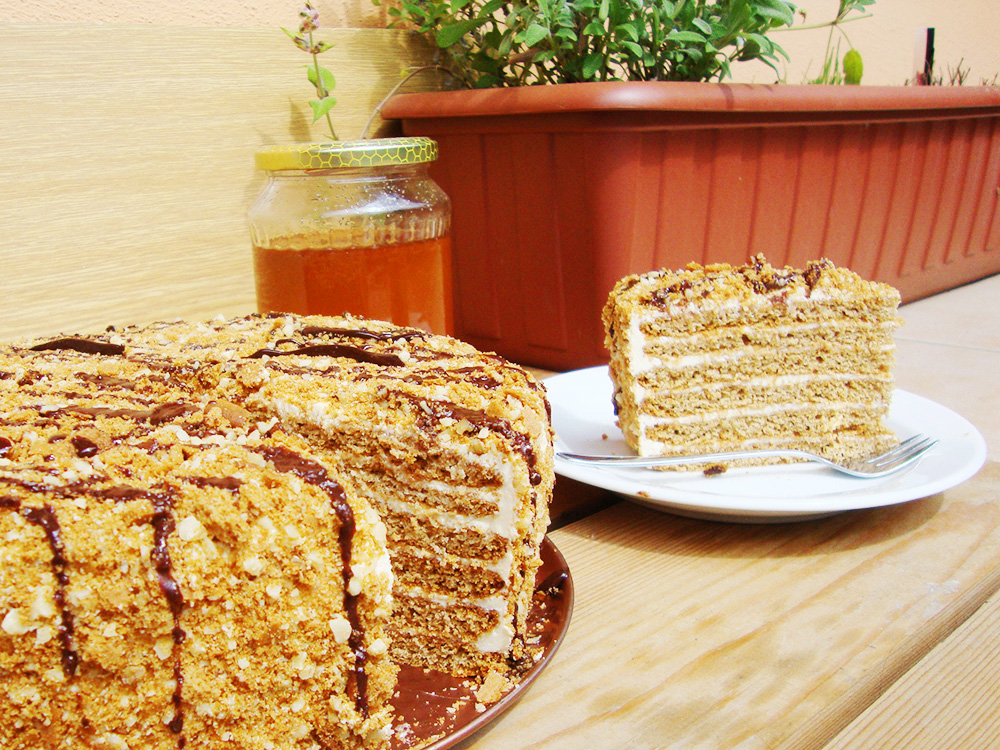 Den předem si připravíme základ na krém. Mléko zahřejeme na plotně a přisypeme mouku. Chvíli odpalujeme a necháme vychladnout. Nachystáme si vodní lázeň. Do misky nalijeme rozpuštěné máslo, med, mléko, přisypeme cukr a přiklepneme jedno vejce. Vše mícháme stěrkou do lesklé konzistence. Do druhé mísy si prosejeme mouku se sodou. Mouku přidáváme k teplé směsi až vypracujeme lepkavé těsto. Zabalíme do fólie a chladíme hodinu v lednici. Troubu předehřejeme na 170 stupňů. Na práci nám budou stačit 2 až 3 papíry s nakreslenými kruhy o průměru 22 cm. Těsto rozdělíme na 7 dílů. Z každého dílu vytvoříme kuličku, rozplácneme a poprášíme moukou. Válíme přímo na papíře zhruba do tvaru kruhu, „přetažené“ těsto okrojíme a odložíme na zbytkovou osmou placku. Pečeme 3 až 6 minut. Placka je po upečení tmavší, ale měkká, proto ji necháme zchladnout, poté jde lépe sloupnout papír. Pokračujeme stejně se všemi zbylými 6 plackami. Osmou zbytkovou placku není potřeba válet do kruhu. Do sáčku ulomíme kousek zbytkové placky, okraj pytlíku přeložíme, položíme na utěrku a přikryjeme. Válečkem nadrtíme najemno s trochou velkých drobků. Rozmixujeme ořechy a promícháme s drobky. Změklé máslo šleháme s cukrem a žloutkem do nadýchané pěny. Postupně zaděláme vychladlou kaši. Na tác položíme jednu placku,potřeme krémem, položíme druhou placku, krém, placka, krém... Na závěr krémem omažeme celý dort. Na pracovní plochu si připravíme drobky. Na levou ruku (pro praváky) si položíme medovník, do pravé dlaně nabereme drobky a táhneme po straně od zdola nahoru. Zbytek drobku rozprostřeme na vrch Medovníku. V misce rozpustíme pár čtverečků čokolády a dort pocákáme. Necháme uležet v lednici alespoň po dobu 2 dnů! Medová Marlenka